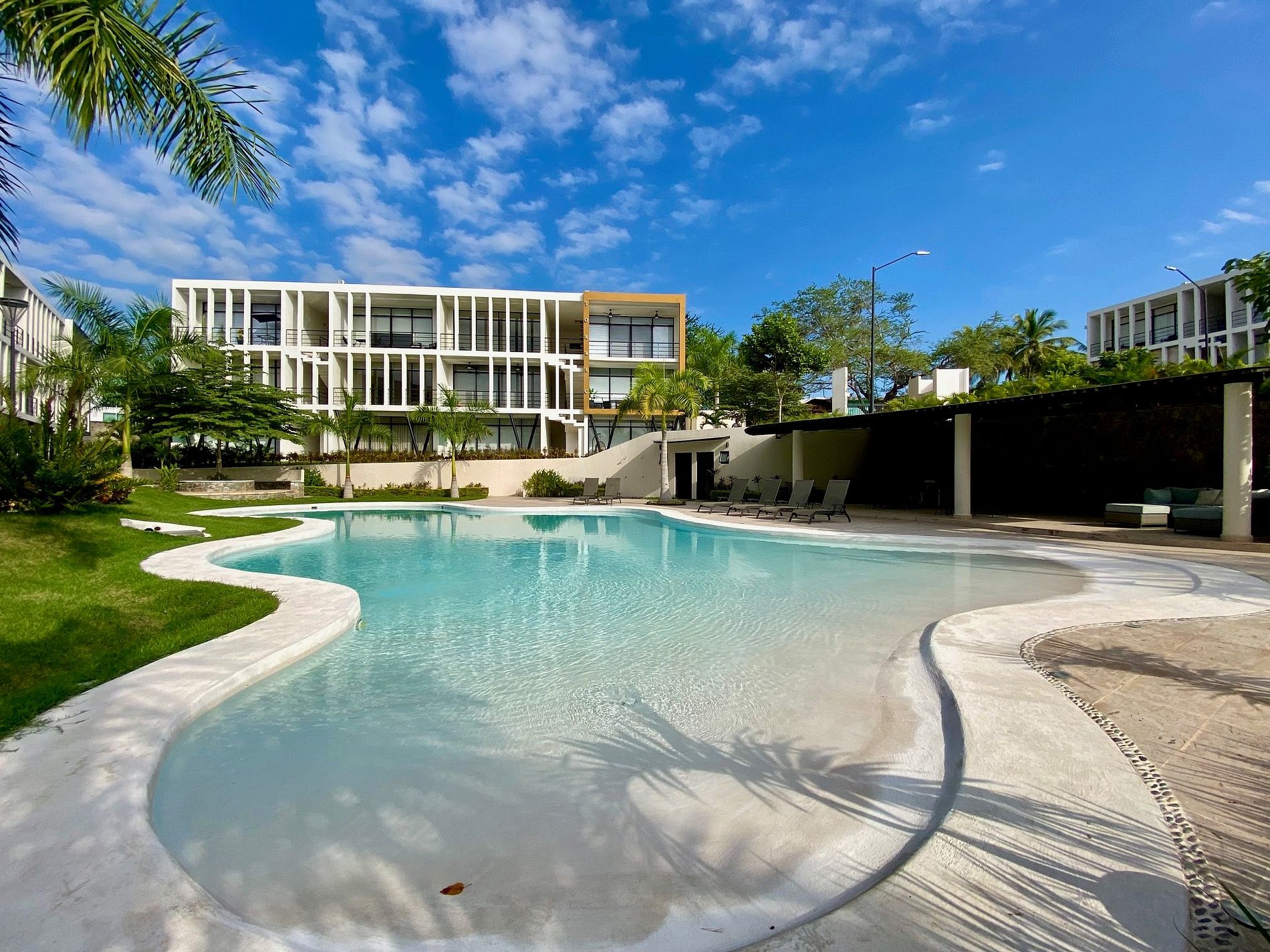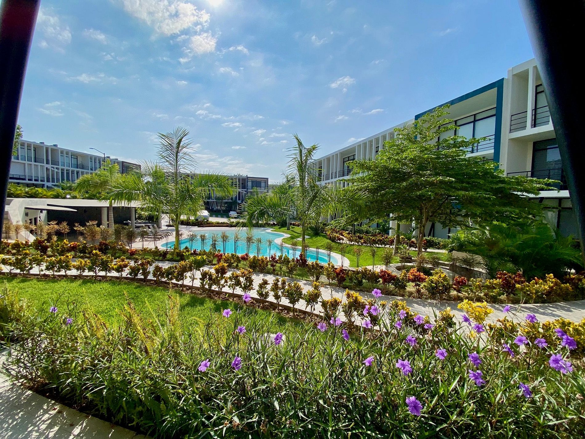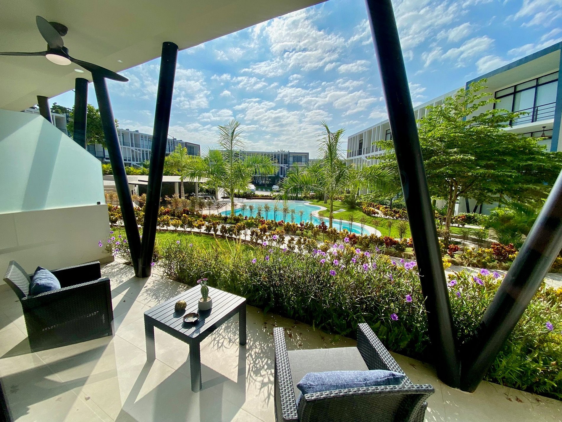 Step outside to your private patio or stroll into the lush common areas. The resort-style pool is perfect for cooling off, with plenty of lounge chairs and shaded spots. Enjoy shared BBQ facilities and access to a well-equipped gym.
