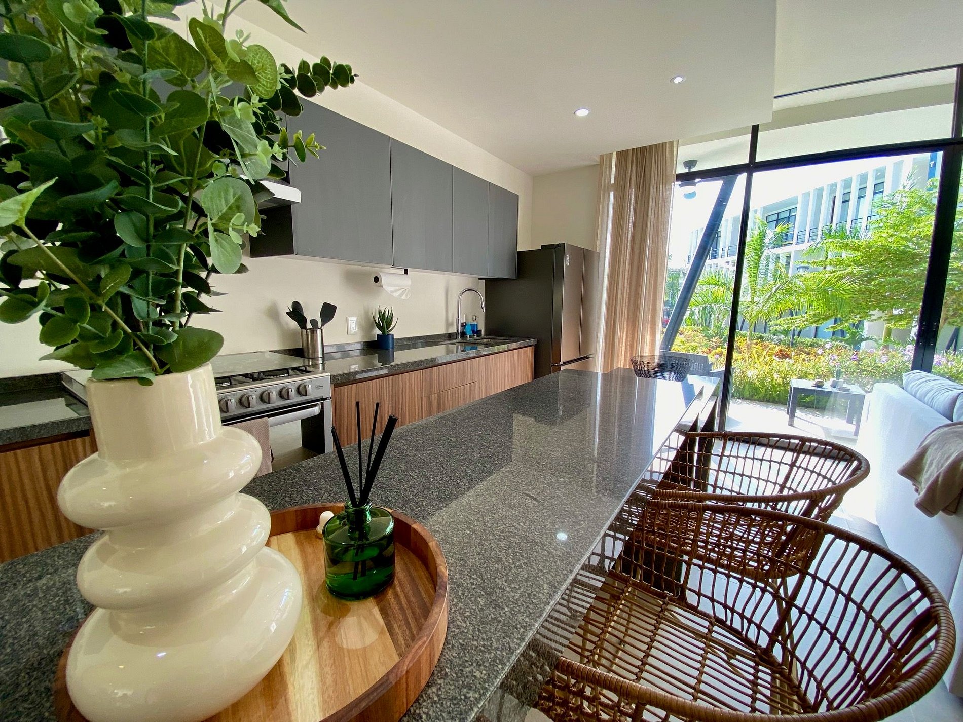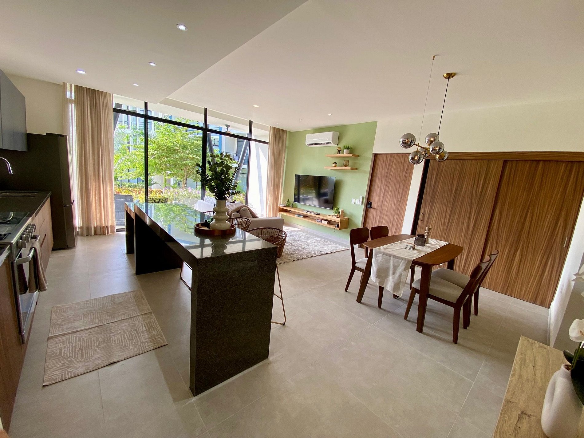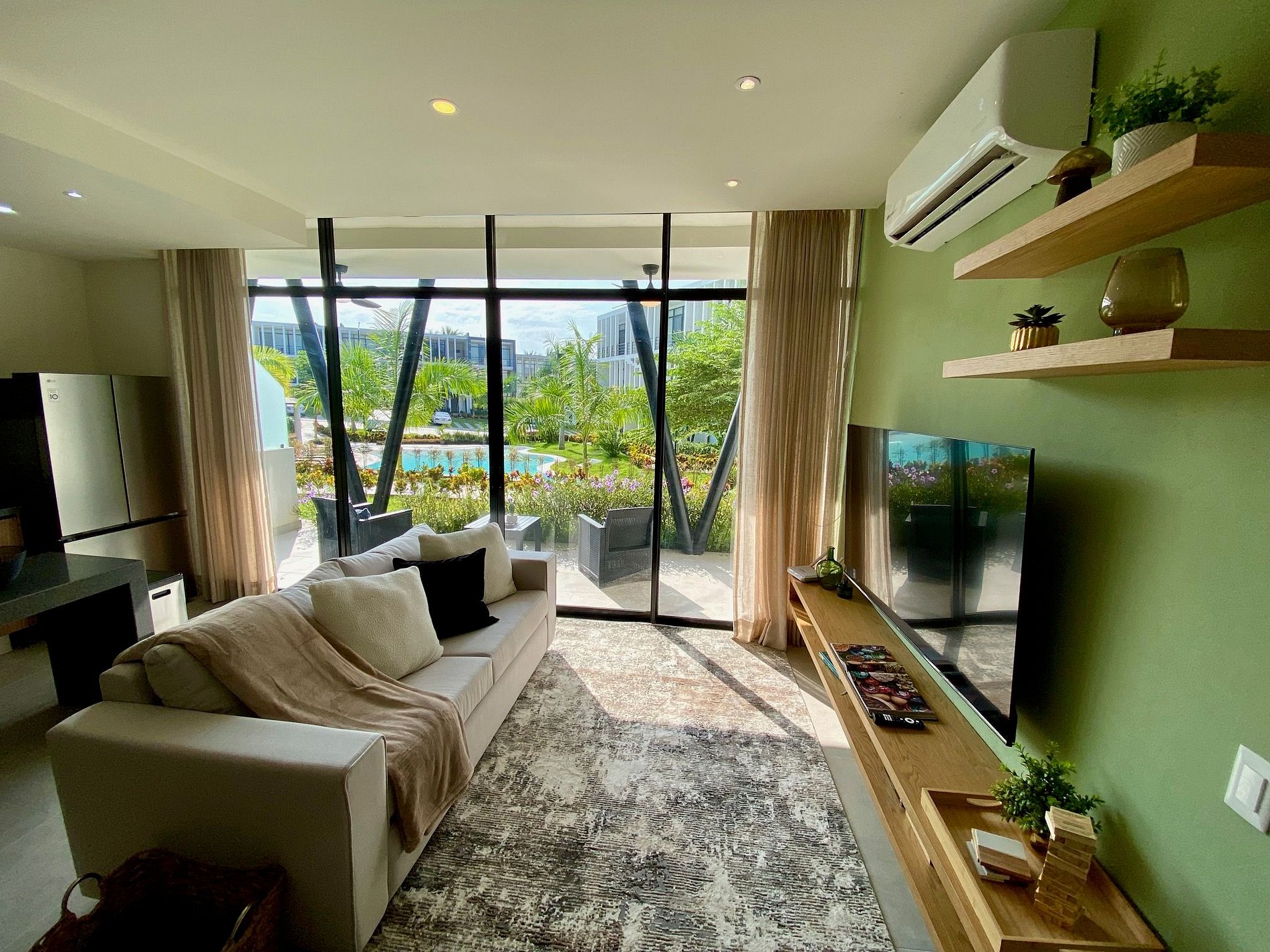 Enjoy an open-concept living area with a comfy sofa, a smart TV with Netflix and Prime Video, and a dining space where everyone can gather. Floor-to-ceiling windows provide abundant natural light and lead to a private patio with outdoor furniture, overlooking lush greenery.