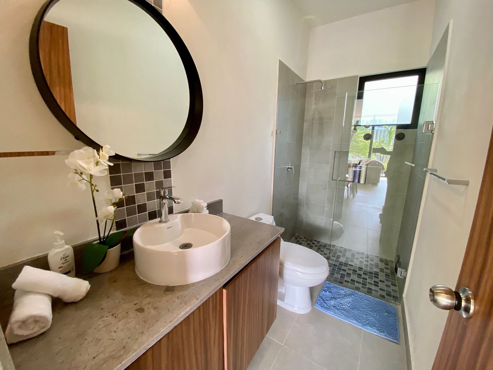 Two modern bathrooms with walk-in showers, stocked with fresh towels, toiletries, and essential supplies.