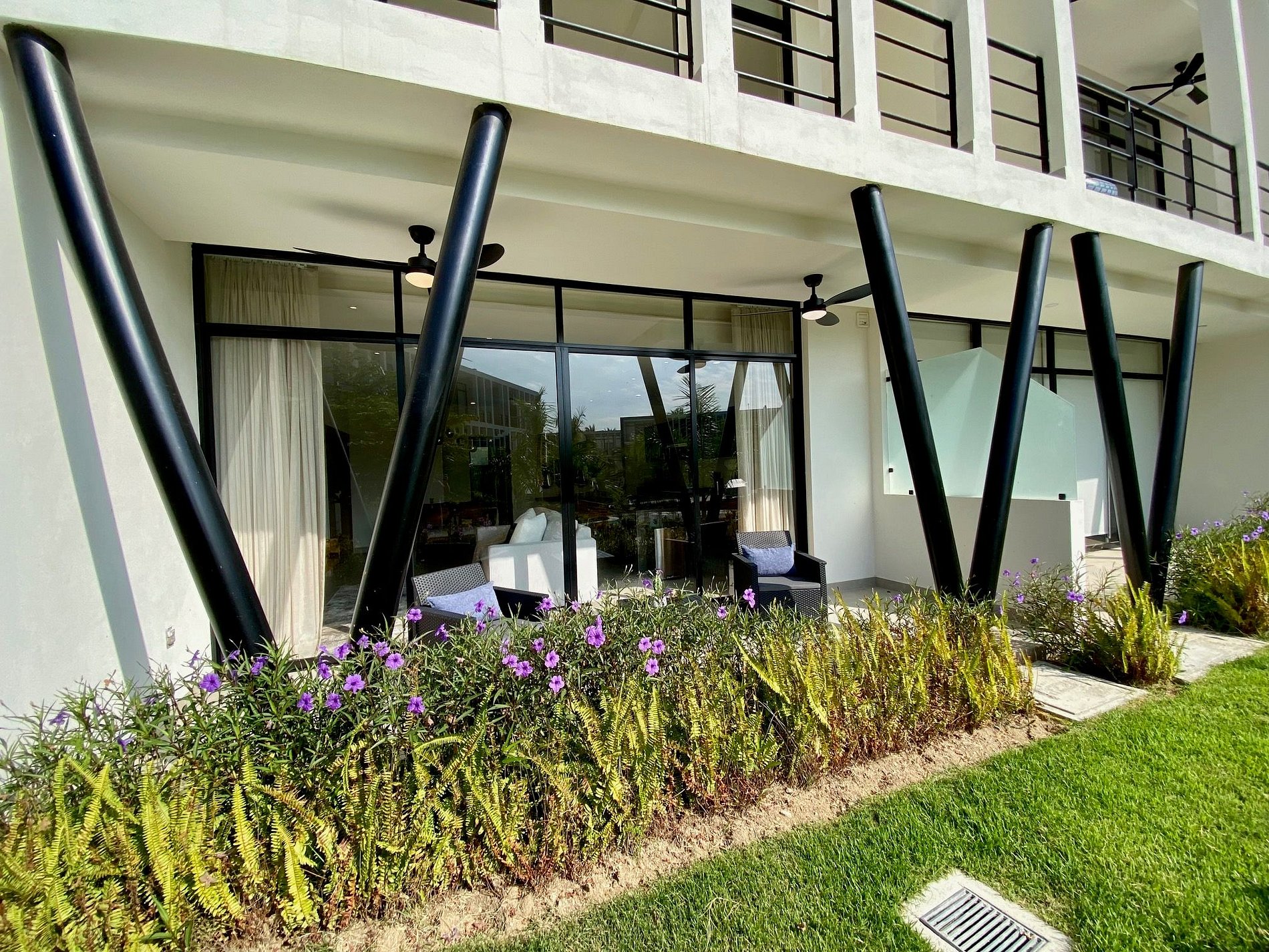 - Unwind in a bright, stylish living area with a smart TV and private patio access.