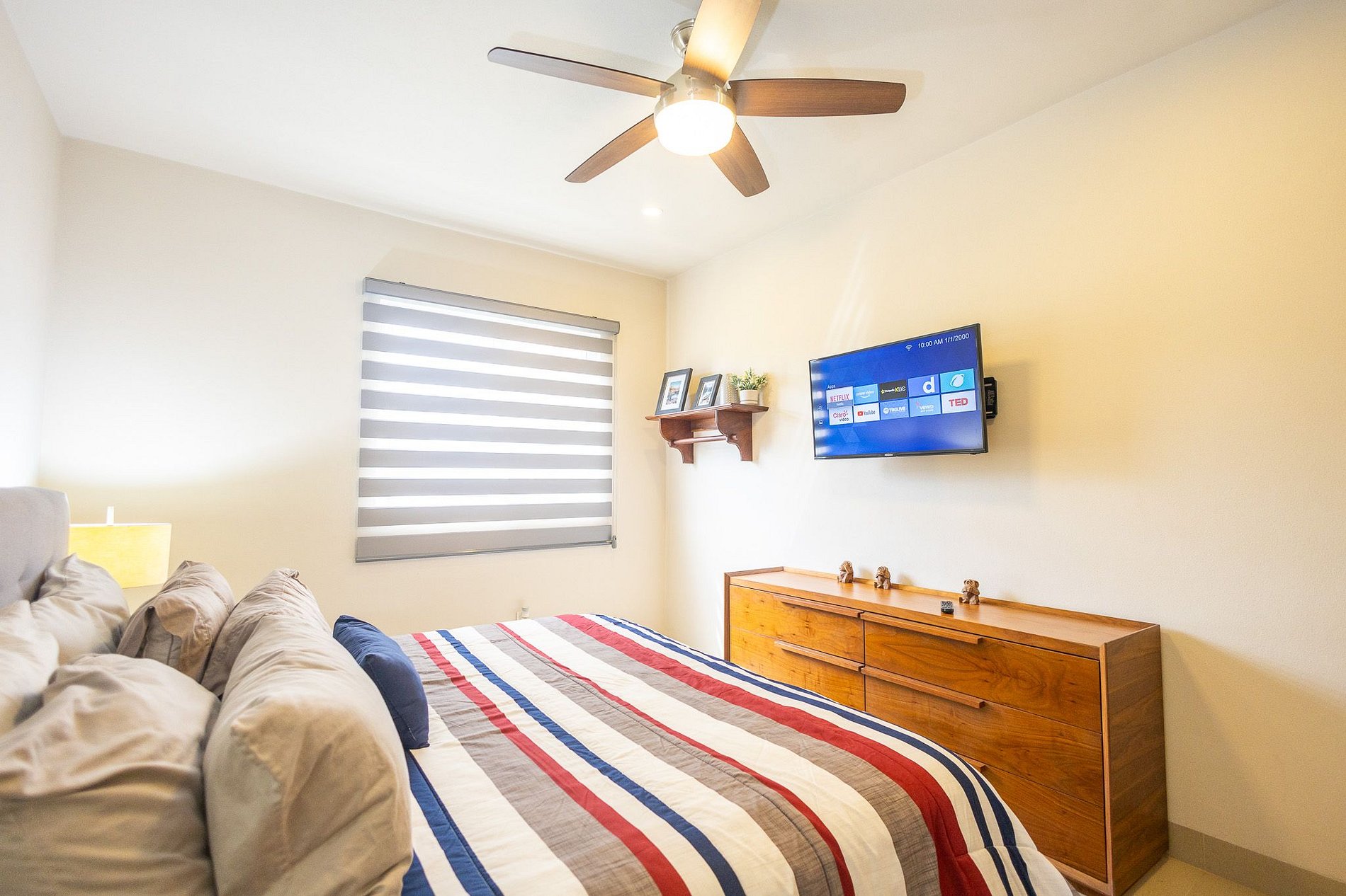 Master: King bed, TV, air conditioning, ceiling fan, ensuite bathroom with double sinks