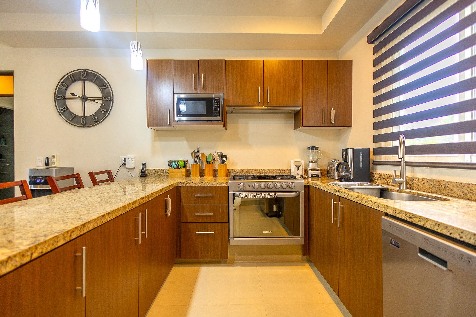 - Experience cooking in a fully equipped kitchen with sleek granite and stainless finishes.