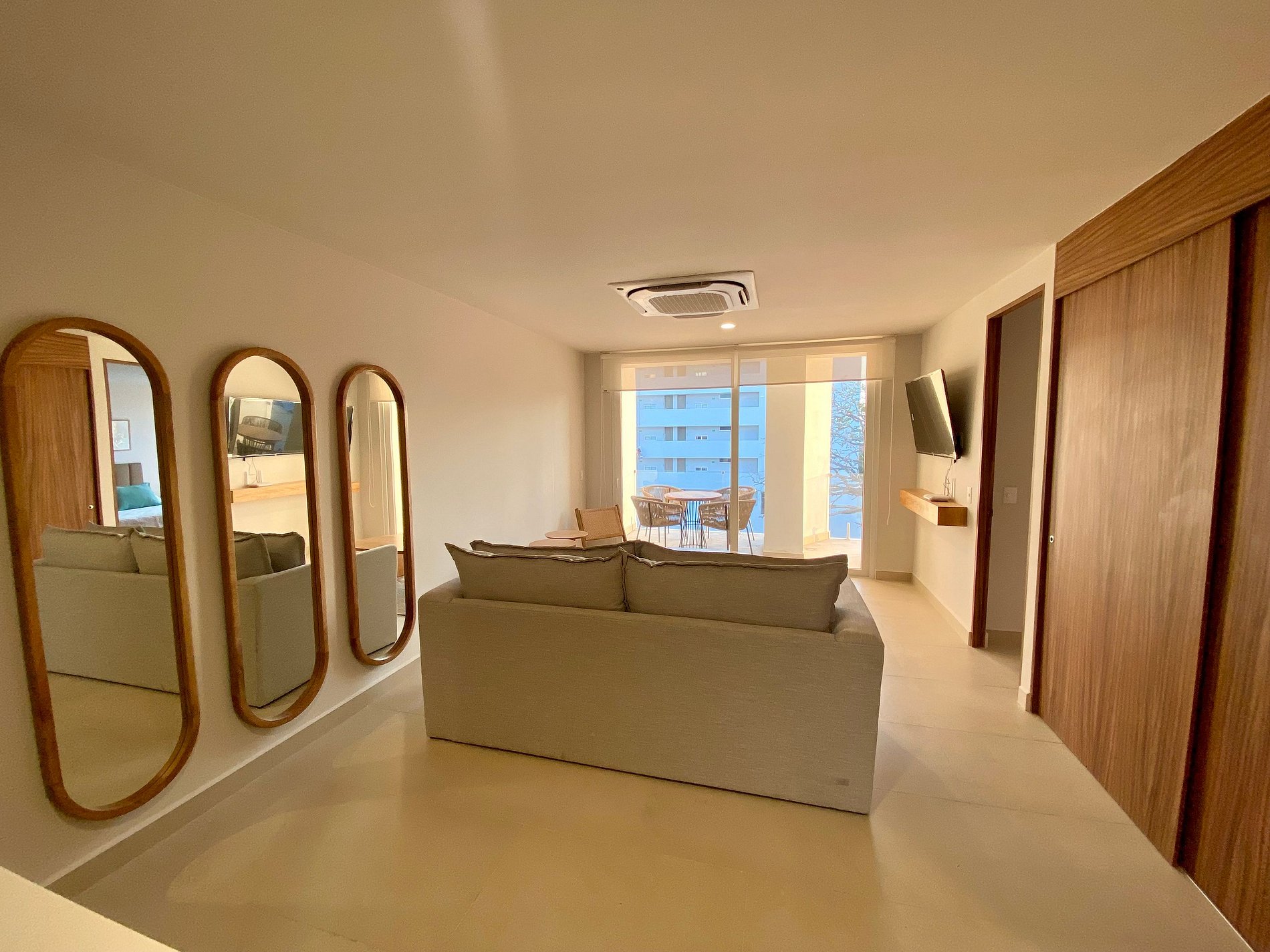 En este departamento ubicado en el cuarto piso, encontrarás un diseño moderno de planta abierta con un cómodo sofá frente al balcón. La habitación recibe mucha luz natural durante el día, y hay acceso directo desde la sala al balcón a través de puertas corredizas de vidrio de pared a pared. Abre las puertas y siente la brisa marina!