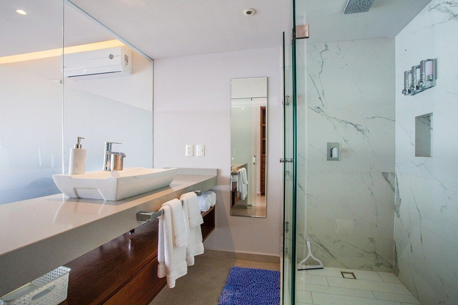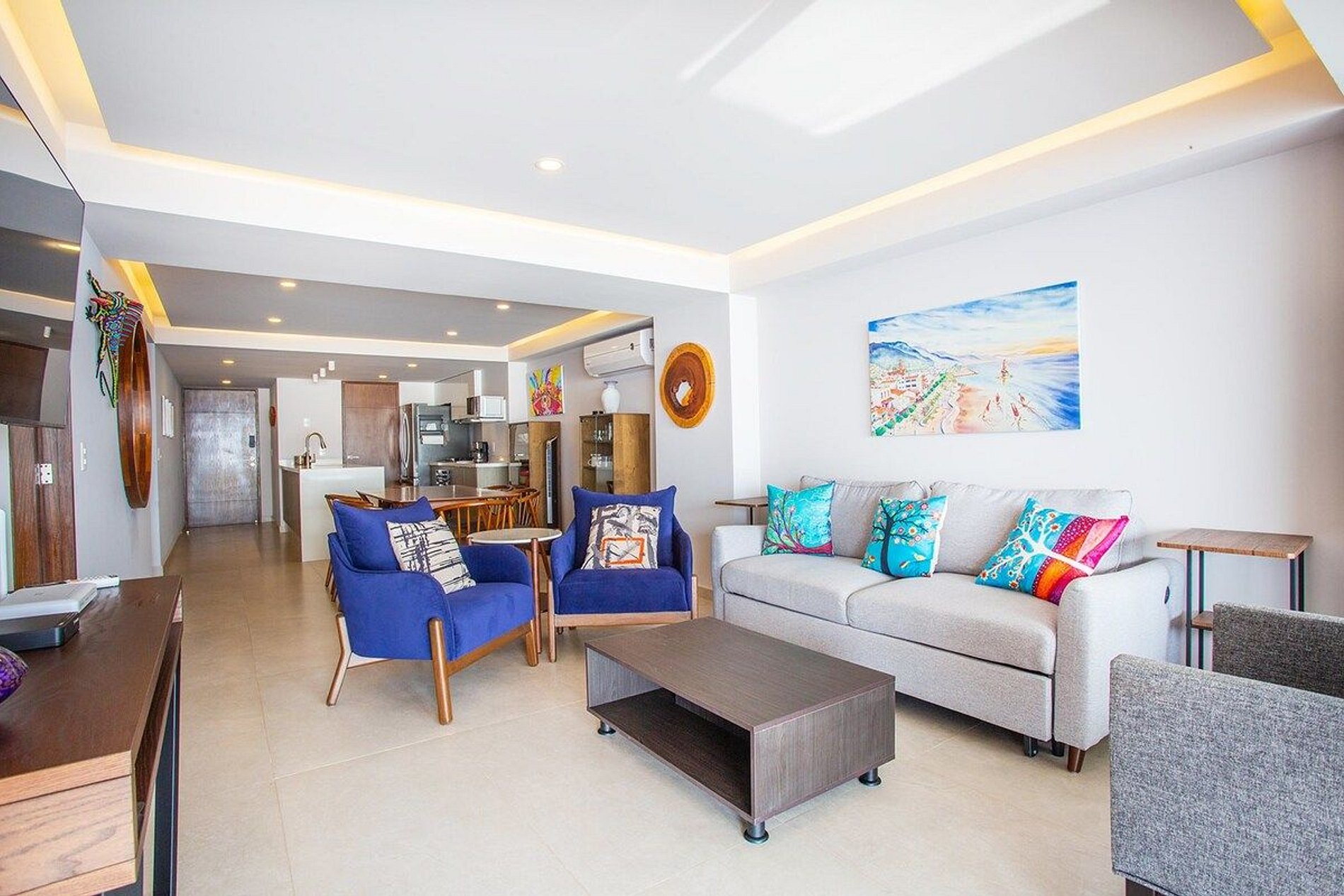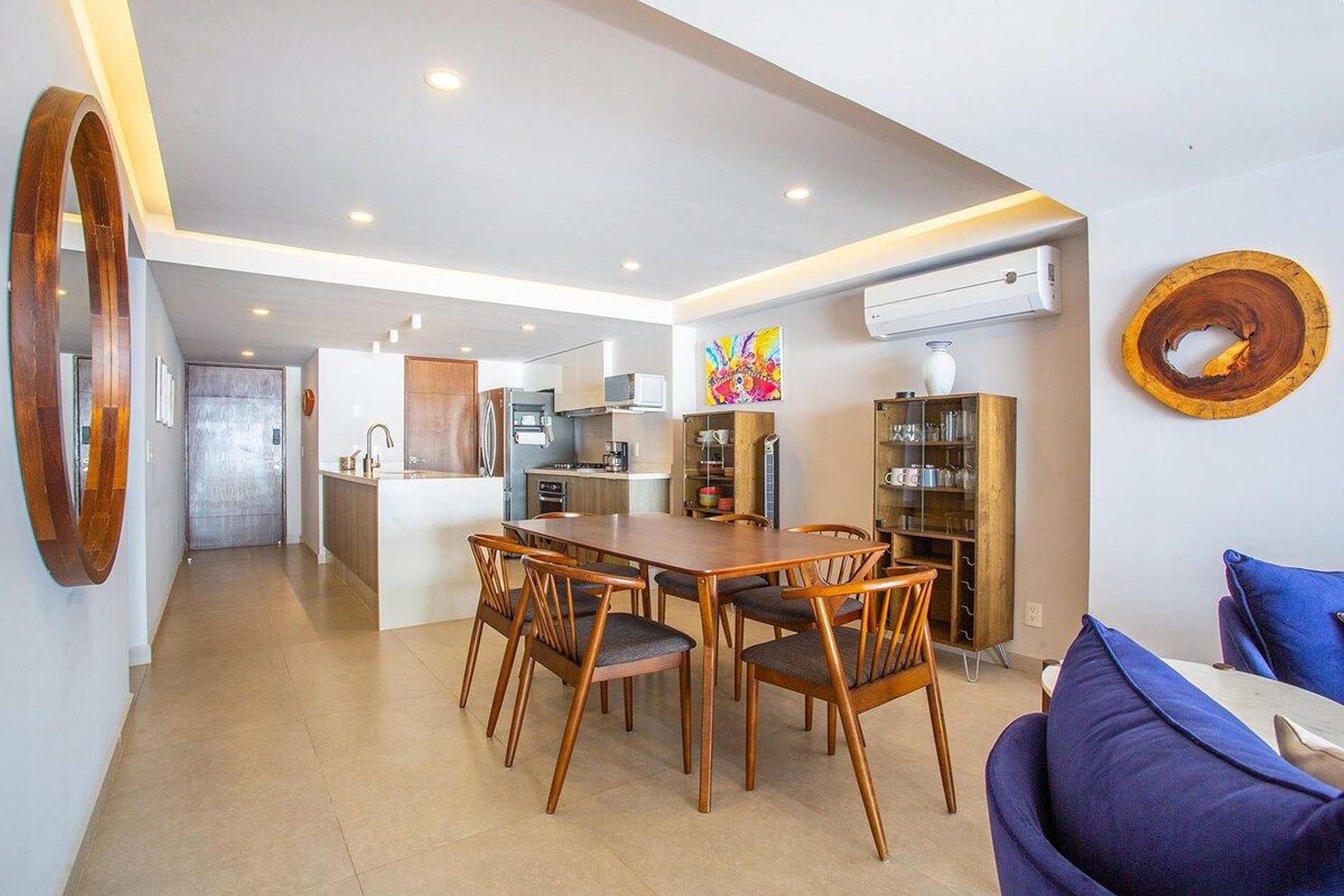 Disfruta de un lujoso y elegante espacio abierto y vistas panorámicas al océano. Relájate en los sofás frente al gran televisor cuando necesites un descanso o disfruta de una buena comida preparada en la cocina completa y come en la mesa del comedor. Luego, toma tu cóctel y dirígete a la terraza privada y al sofá, donde presenciarás algunos de los atardeceres más impresionantes de Vallarta.