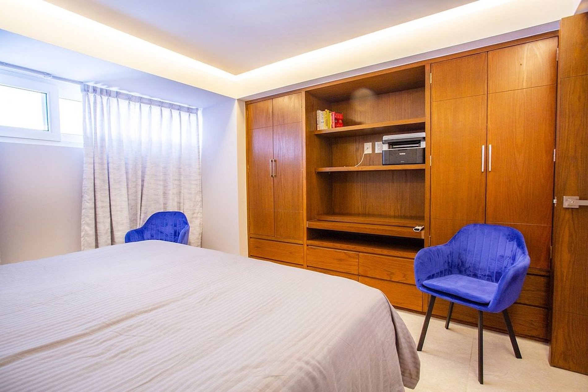 Hay dos dormitorios de buen tamaño, ambos con camas king, uno es la suite principal con baño privado. Y, si necesitas dormir a una 5ta persona, puedes hacerlo cómodamente en el sofá de la sala.