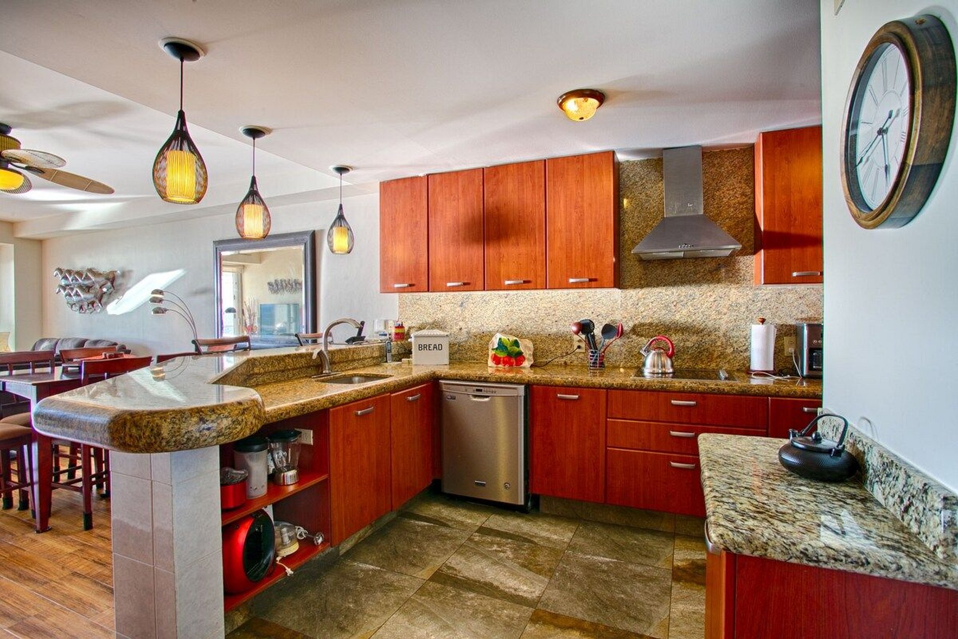 Hay una cocina totalmente equipada con encimeras de granito y electrodomésticos de calidad para preparar comidas en casa. Además, una barra de desayuno para disfrutar de un bocadillo rápido y una gran mesa de comedor para algo más formal. Por supuesto, hay una acogedora zona de sofás con TV para disfrutar de momentos juntos.