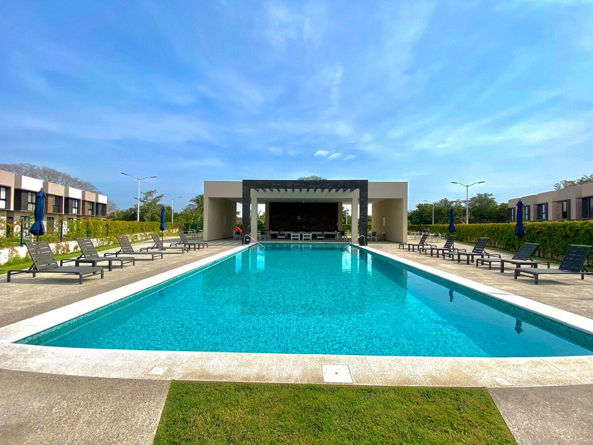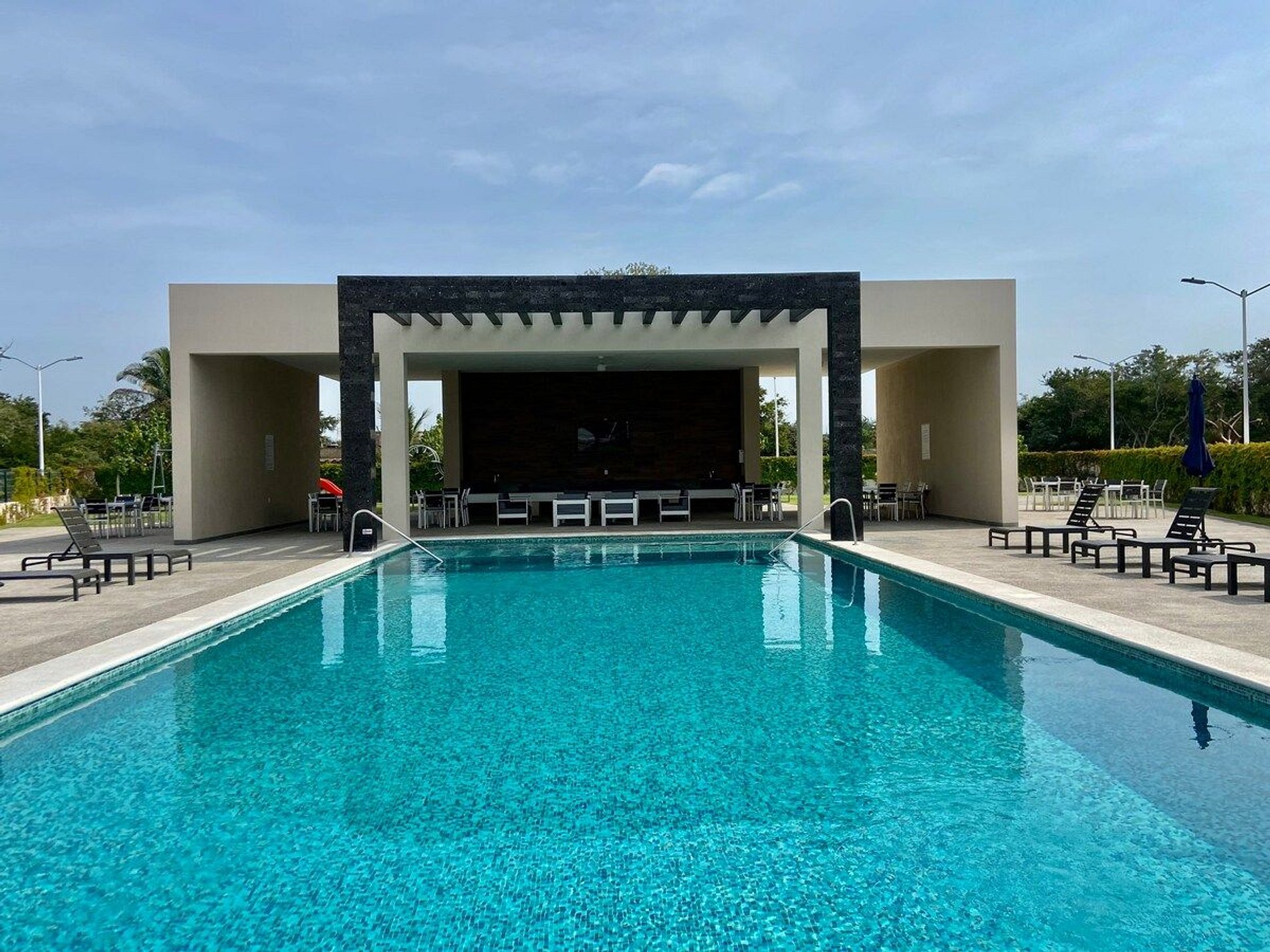 - Comodidades como una gran piscina, sillas para tomar el sol, área de comedor sombreada, parrilla BBQ y parque infantil