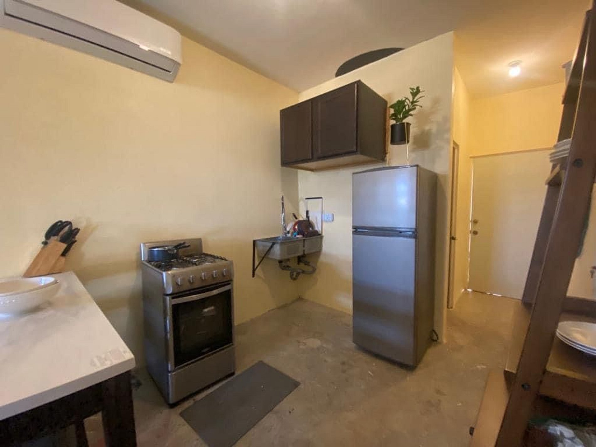 Hay una cocina semi-equipada para preparar algunas comidas básicas en casa si lo deseas, así como una lavadora para mayor comodidad. Hay un acogedor salón con sofá y una mesa de comedor para disfrutar de las comidas o trabajar en tu laptop si es necesario.